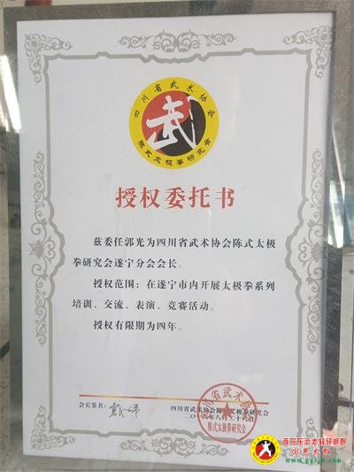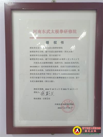 遂宁东武国光太极授权为河南郑州东武太极研修院遂宁分院