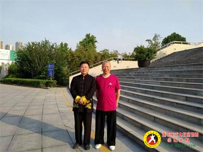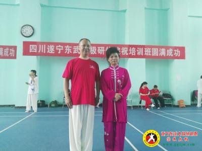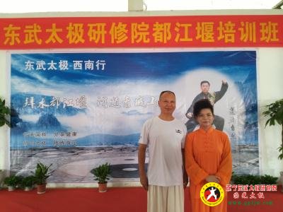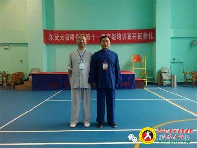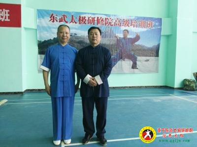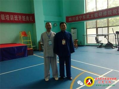 郭光和师父张东武在四川遂宁东武太极研修院祝贺横幅下留影