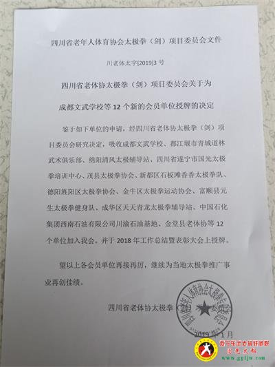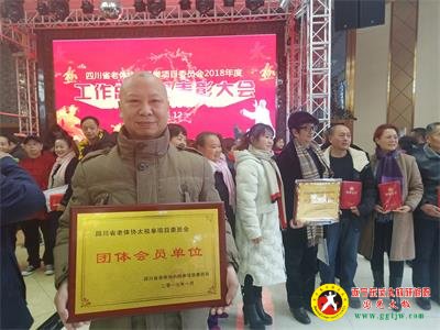 2019年1月12日,四川省老体协太极拳项目委员会年会在成都金牛区荷花山庄举行。四川省武术协会领导、四川省老体协领导、四川省老协太极拳项目领导及理事参加了年会。大会作了2018年总结和2019年工作计划报告,表彰了先进会员单位及个人,吸纳了“四川省遂宁市国光太极培训中心”等十二家新的单位会员并授牌,遂宁”国光太极“郭光老师参加了此次年会并接受"单位会员"的授牌,至此,遂宁”国光太极“成为“四川省老体协太极拳项目委员会”单位会员,郭光老师也成为”四川省老体协太极拳项目委员会理事“。遂宁国光太极将为遂宁的老年人体育运动、健康快乐、太极拳服务方面作出应有的贡献!