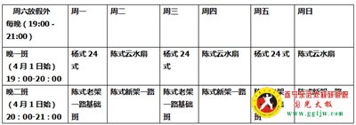 遂宁东武国光太极2019年春季招生开始,4月1日在河东体育中心拳馆新班正式行课,晚上19:00-21:00分两堂课,四个新套路同时开班,为零基础的学员安排“杨式24式”,为陈式爱好者安排“老架1路”基础班,为有基础的学员安排了“陈式新架1路”和“陈式云水扇”;为高端人士准备了白天的VIP贵宾一对一教学服务,也为非会员安排了小班学习,具体安排如下: