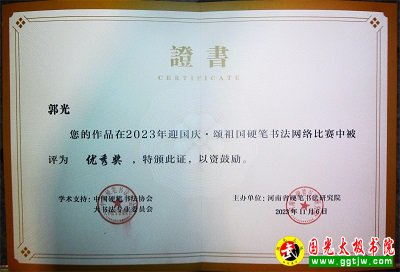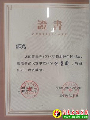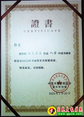 郭光入围中国书画家联谊会2023年书画教育名师邀请展 2024-05-19 郭光老师书法作品入围中国书画家联谊会2023年书画教育名师邀请展 之前郭光老师荣获2023年“迎国庆、颂祖国”书法比赛优秀奖 2023全国临池杯硬笔书法大赛中获优秀奖